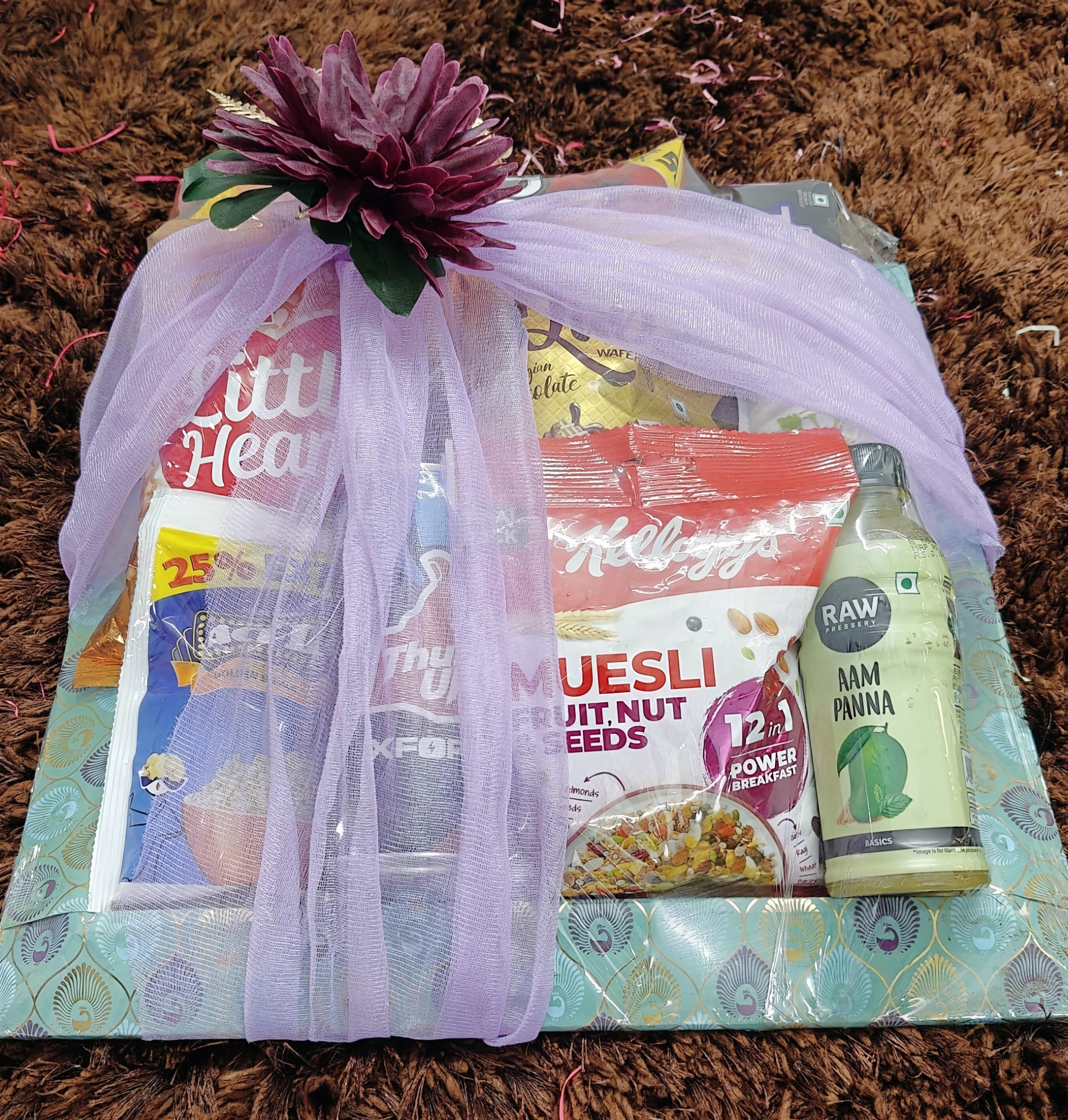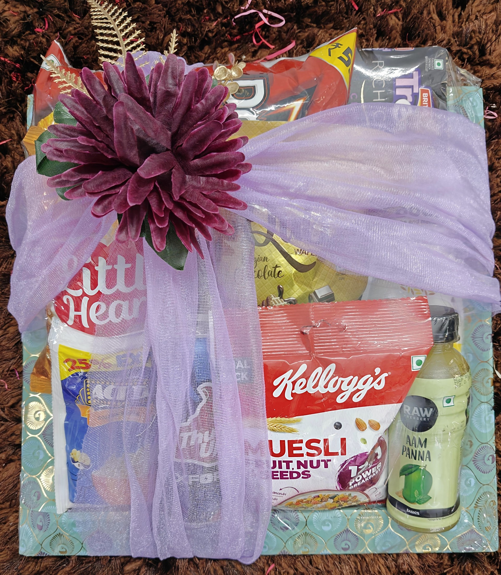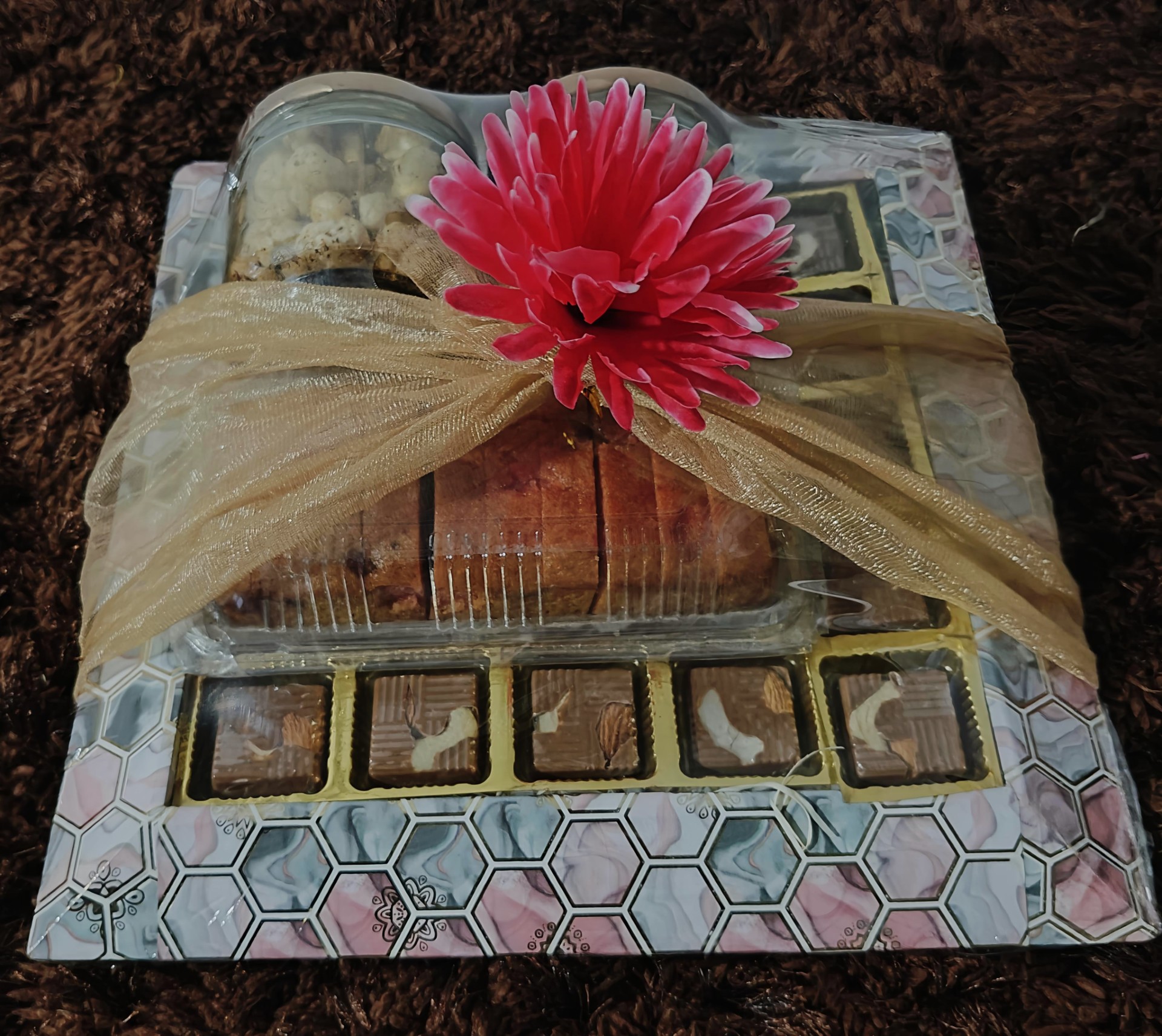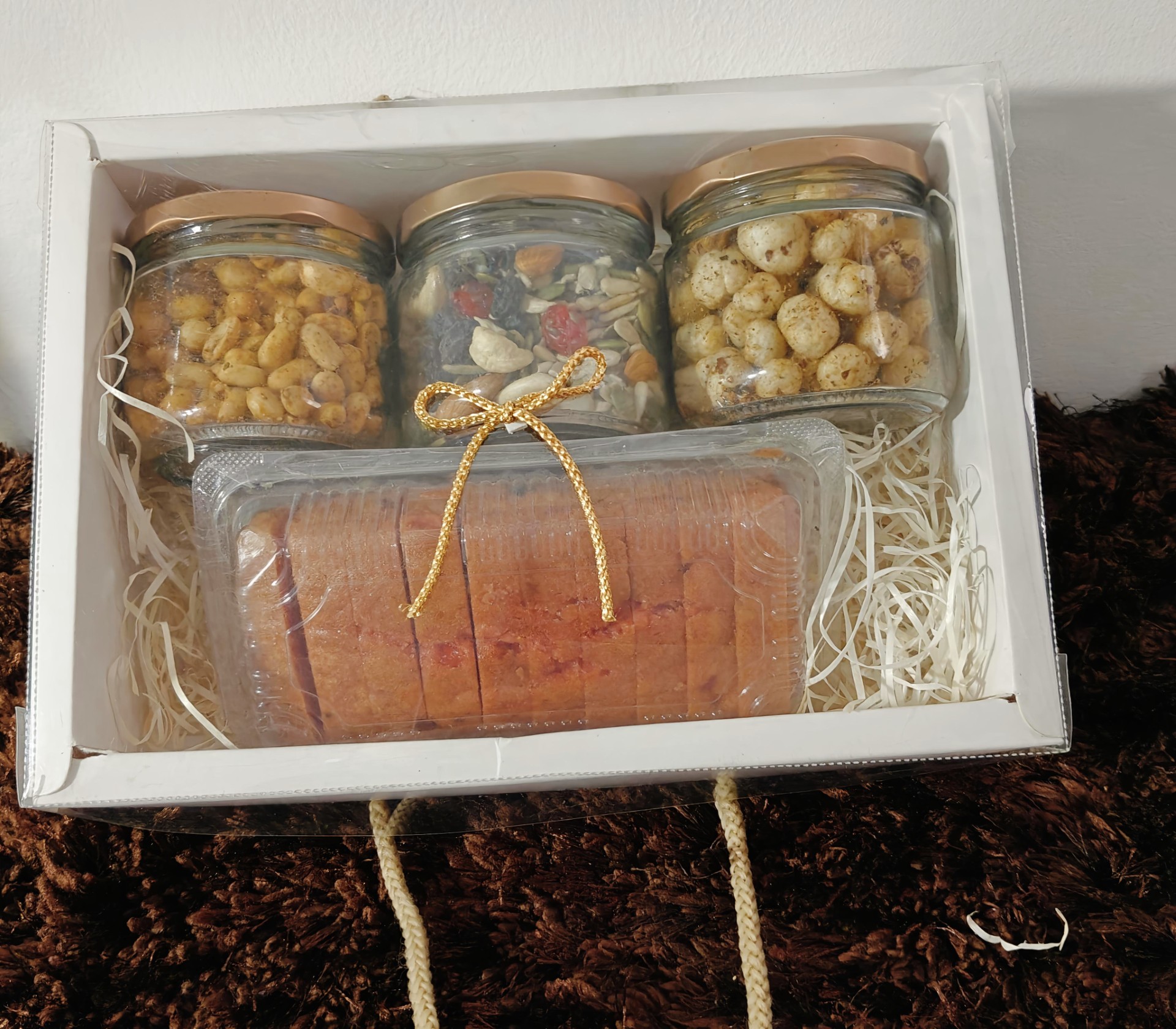 Includes Flavoured Makhana, Flavoured Peanuts, Mixed Seeds, Premium chocolates and Dry Cake (200g)