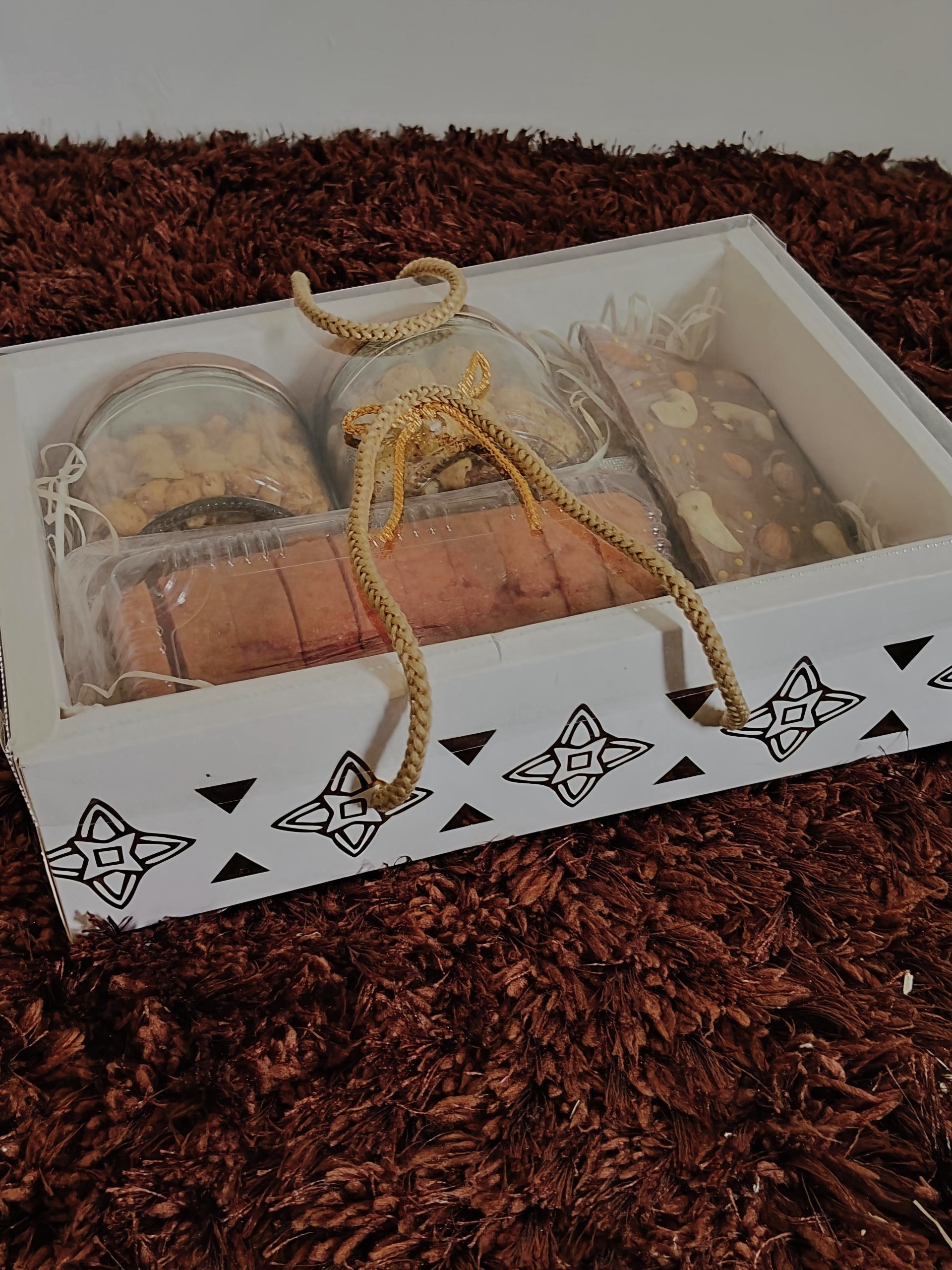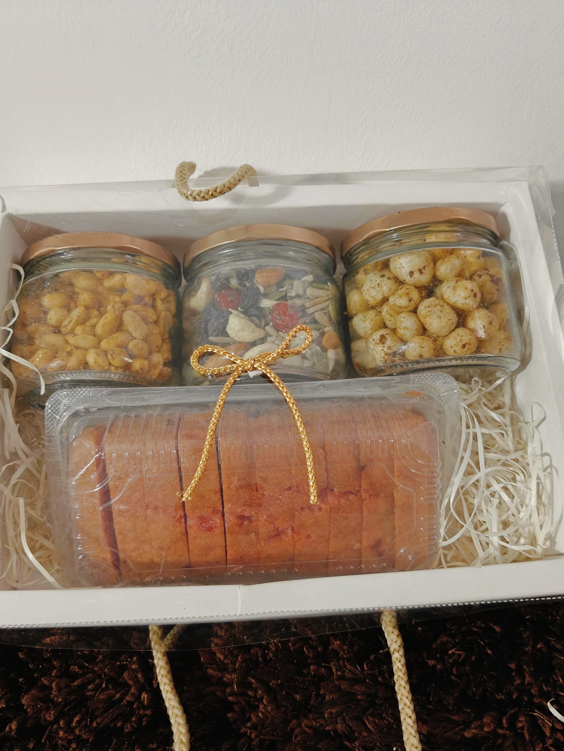 Includes Flavoured Peanuts, Flavoured Makhana, Premium Chocolates and Dry Cake (200g)