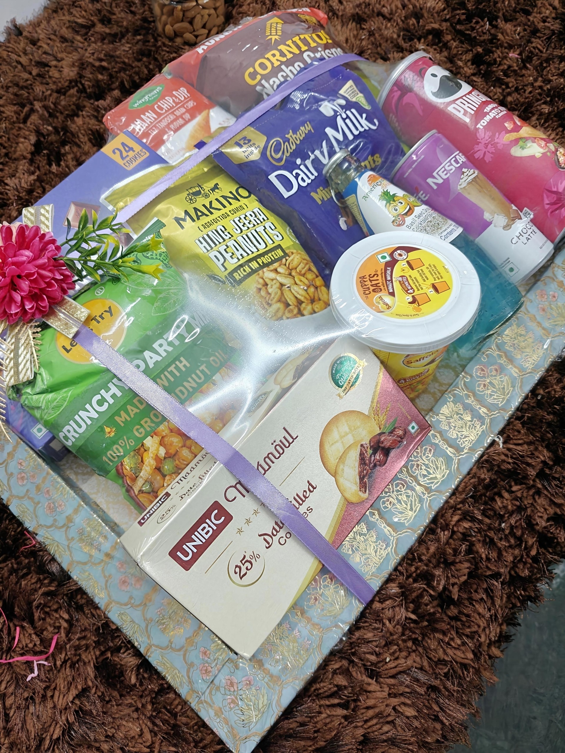 Includes Cadbury Cookies, Naan chips and dip, Cornitos, Party Mix, Makino Peanuts, Dairy Milk Treats, Date filled Cookies, Cup oats, Basil seeds drink, Nescafe Latte and Pringles