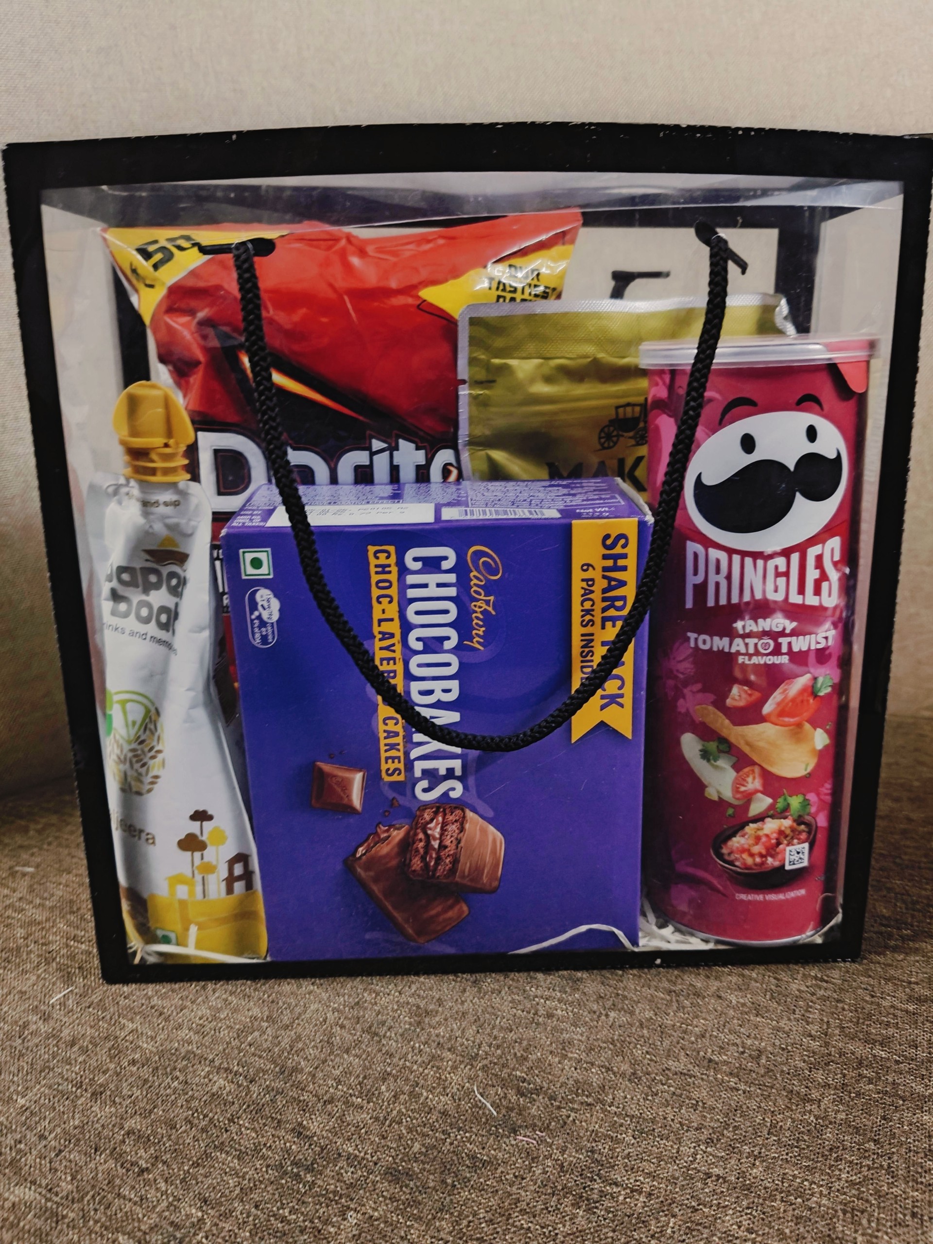 Includes Doritos, Makino flavoured peanuts, Pringles, Cadbury chocolates and Paper boat drink