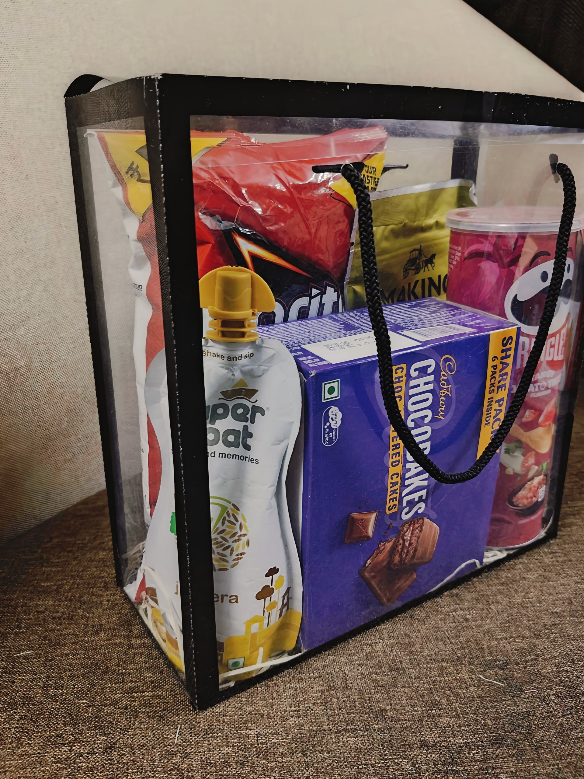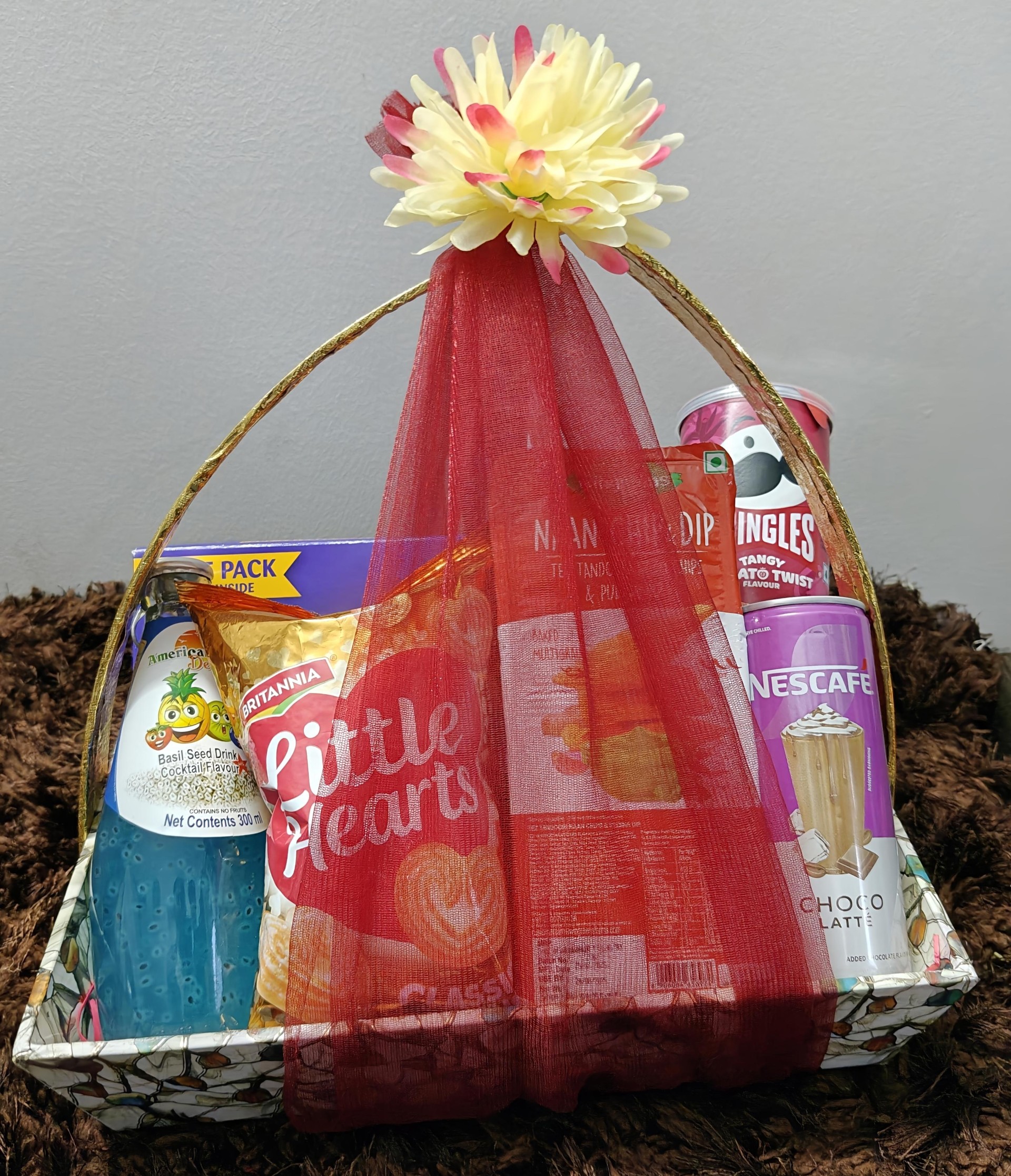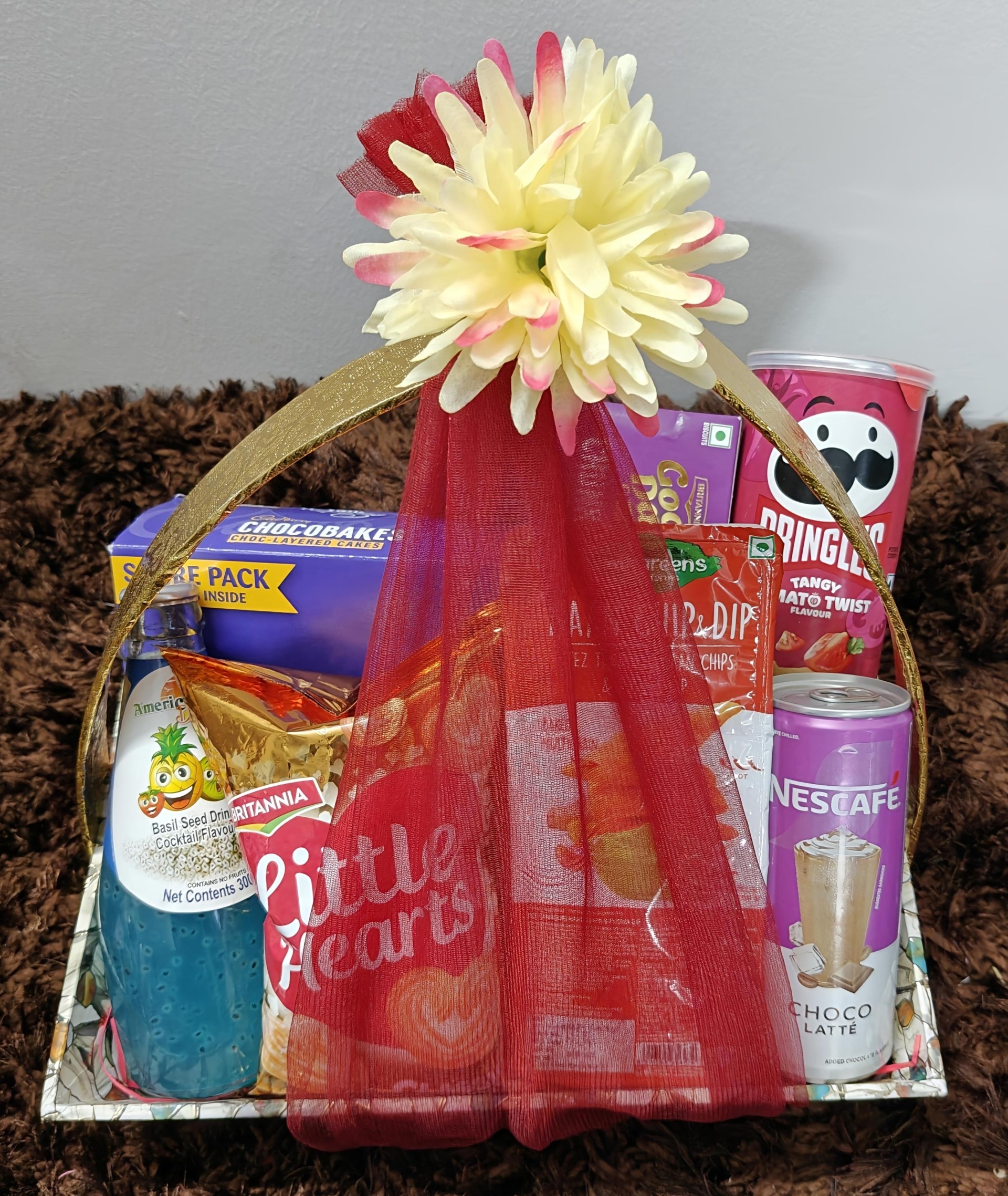 Includes Naan Chips and dip, Nescafe Latte, Basil Seed drink, Cadbury Chocobakes, Cookies, Pringles and Little Hearts