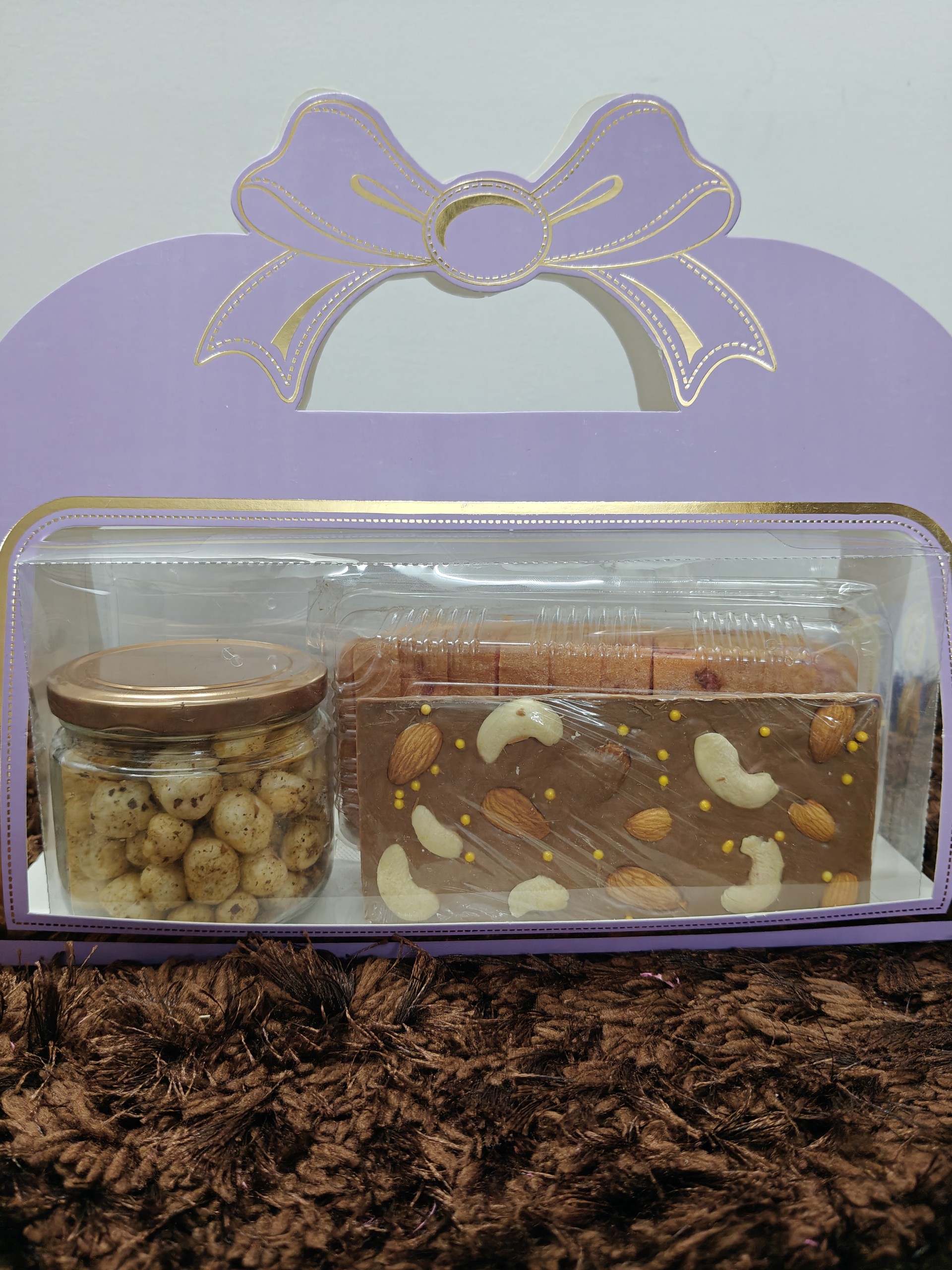 Includes Dry Cake (200g), Flavoured Makhana and Premium Chocolate Bar